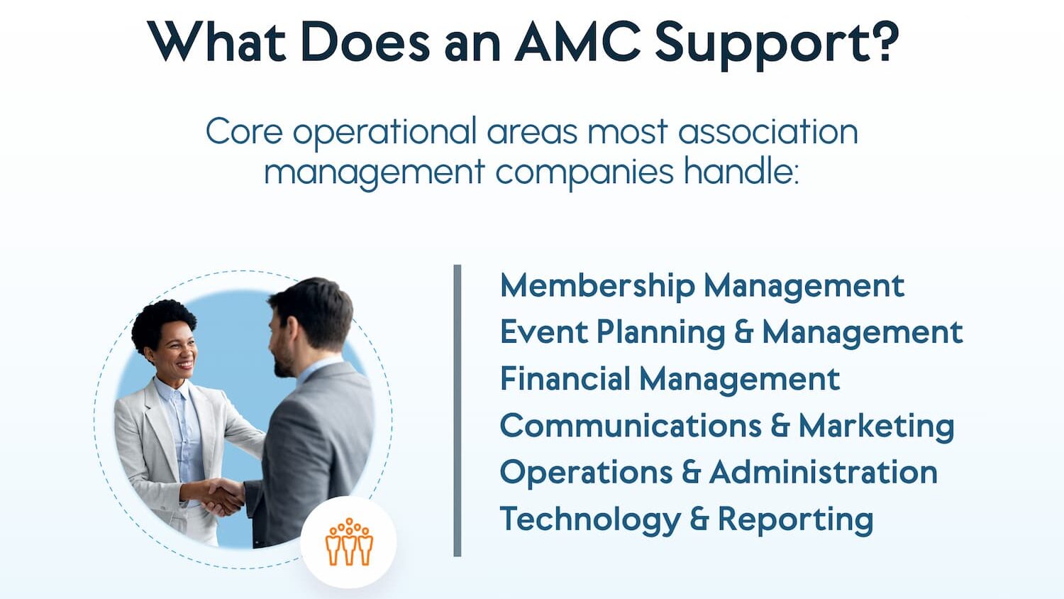 An Association Management Company (AMC) is a for-profit firm that provides professional management services for associations, nonprofit organizations and trade groups. Instead of building a large internal team, associations partner with an AMC to manage administrative, operational and strategic responsibilities.
